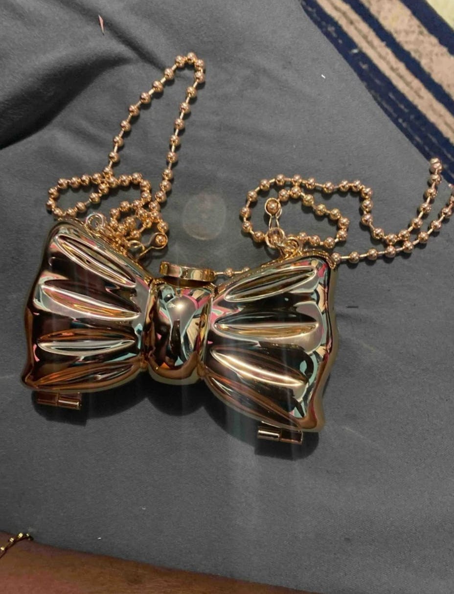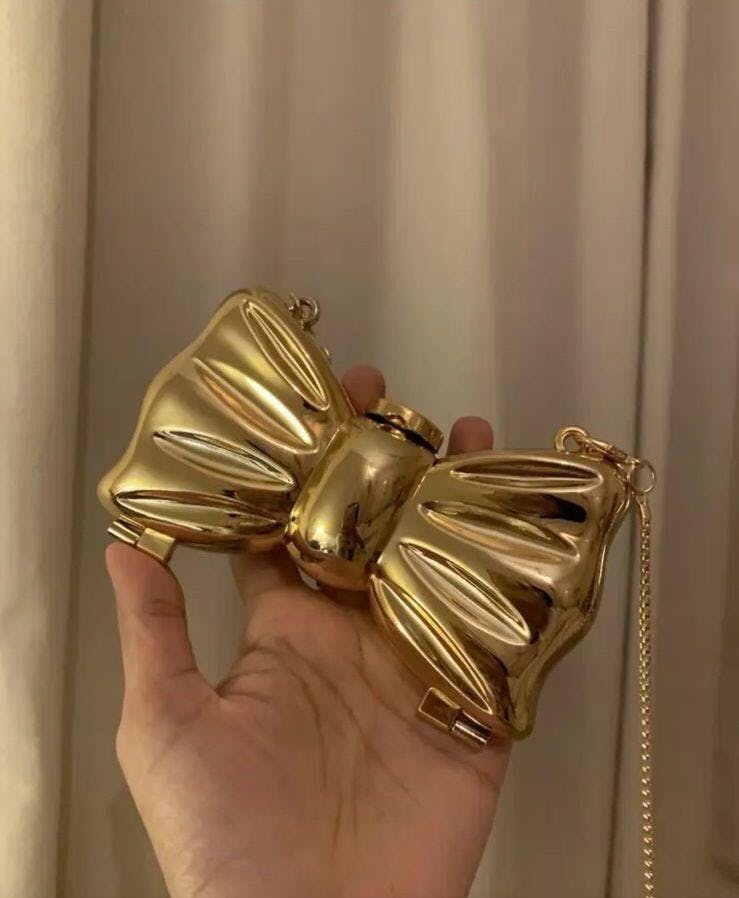 Make a dramatic entrance with the dazzling Bow Clutch! This unique piece is a true statement accessory, molded into the shape of a luxurious, oversized bow. Finished in a high-shine metallic gold, this structured clutch is designed to hold your essentials for a glamorous night out. It comes complete with a delicate gold chain strap for versatile shoulder or crossbody wear, ensuring you sparkle from every angle.