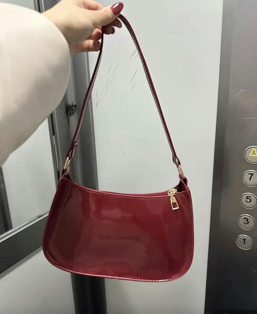 Make a statement with the Burgandy Affair shoulder bag. This accessory embraces the popular '90s baguette silhouette with a modern twist, featuring a gorgeous high-shine patent finish in a deep, luxurious burgundy red. Its sleek, curved profile tucks perfectly under the arm, instantly adding a rich pop of color and glossy texture to any evening or daytime ensemble.