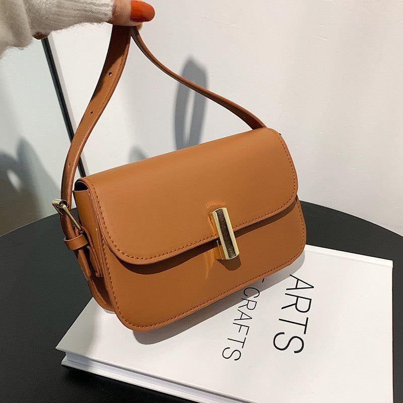 Capture the warm glow of sunset with the Golden Hour bag. This shoulder/crossbody bag features a rich caramel brown/tan leatherette finish with a smooth, polished look. The clean flap closure is highlighted by a simple, sleek gold-bar lock, giving it a modern, elevated feel. It’s the versatile, structured piece that beautifully complements both casual and professional attire.